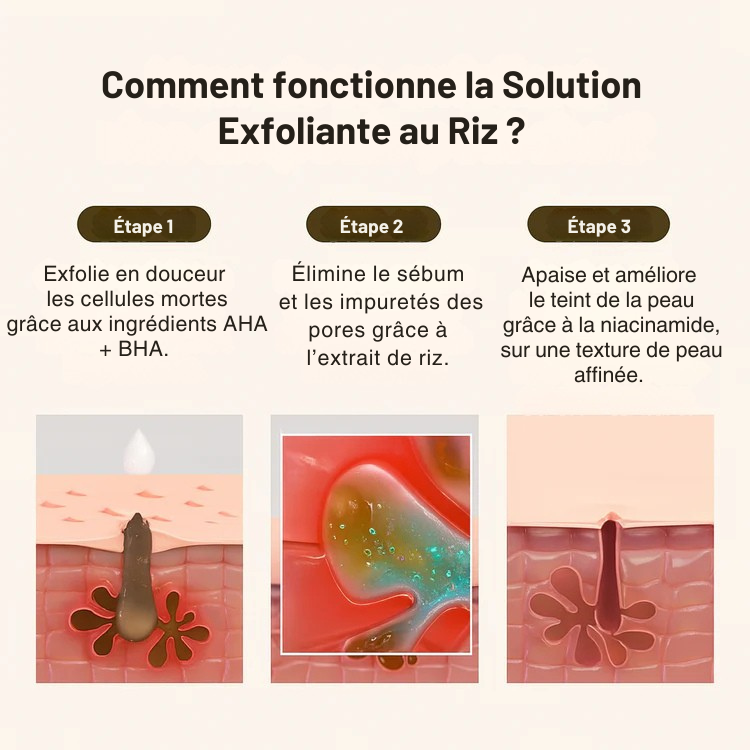 La Solution Naturelle au Riz exfolie en douceur, désobstrue les pores et ravive instantanément les peaux ternes. Enrichie en extrait de riz, elle hydrate, lisse et révèle un teint éclatant sans irritation.